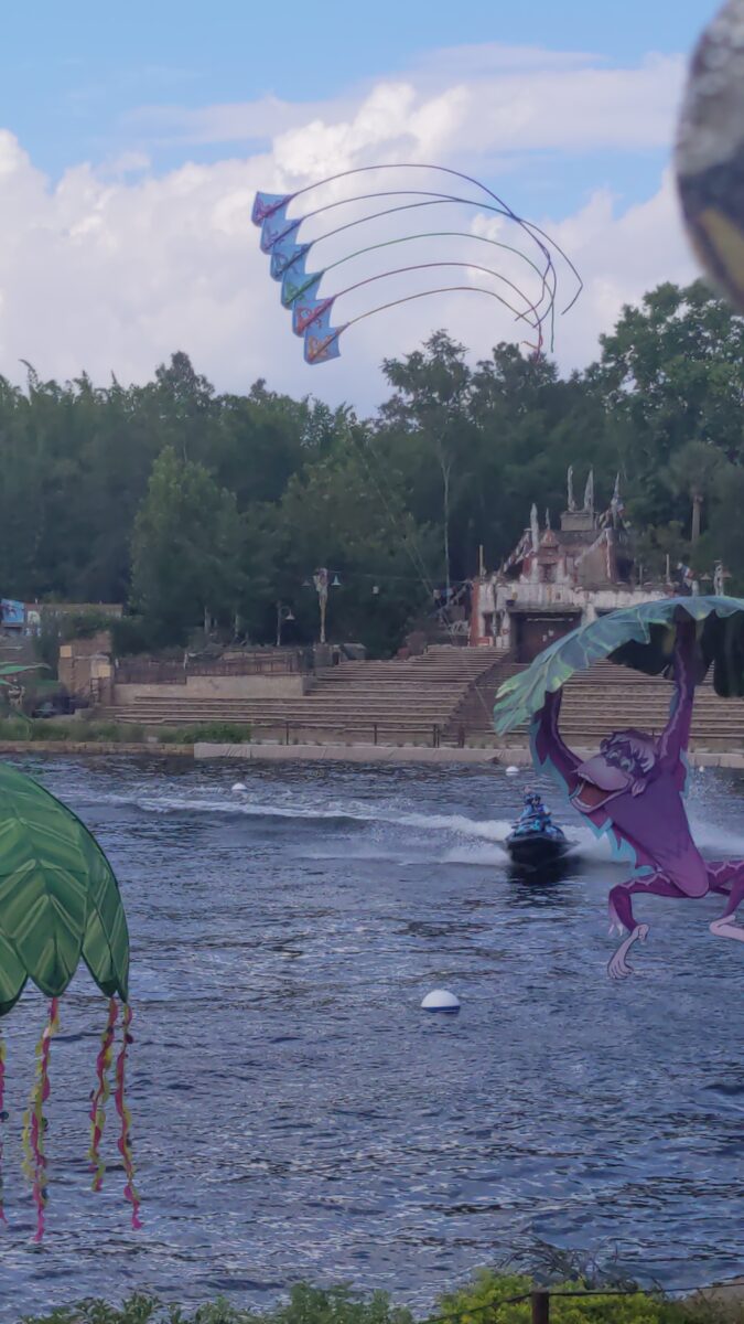 Disney KiteTails is a brand new show at Animal Kingdom added just in time for the Disney World 50th Anniversary! You can see it in the same place where River of Lights used to be. It features, as the name implies, kites. My favorite kites are the ones with Disney characters, like the ones of King Louie from The Jungle Book and Flounder from The Little Mermaid. There is also some jet skiing action which was my favorite part.