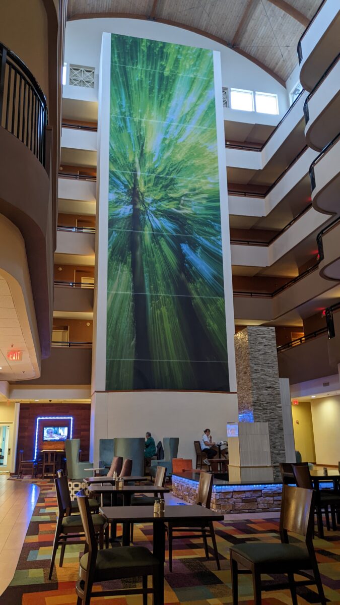 But it was attractive on the inside as well. The breakfast area is nice and open. It has an atrium-style lobby so you can look down at the first floor from any of the floors. And I really love the mural they have over the elevator. It is really nice to look at when you eat breakfast (more about the free breakfast later).