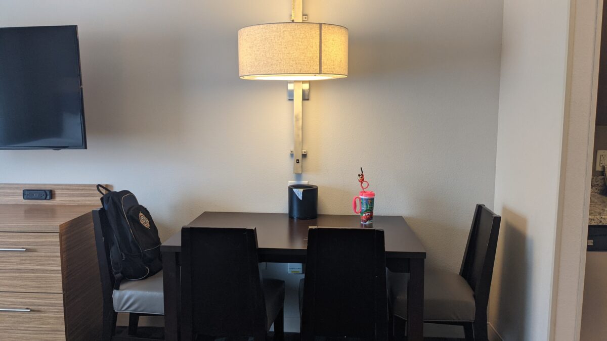 So I don’t know about you, but I’ve stayed at hotels before that had full kitchens, but then only two chairs. That is frustrating if you are part of a family of four who all want to sit down when they are eating.