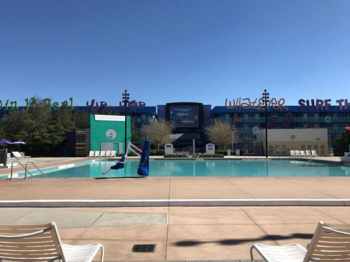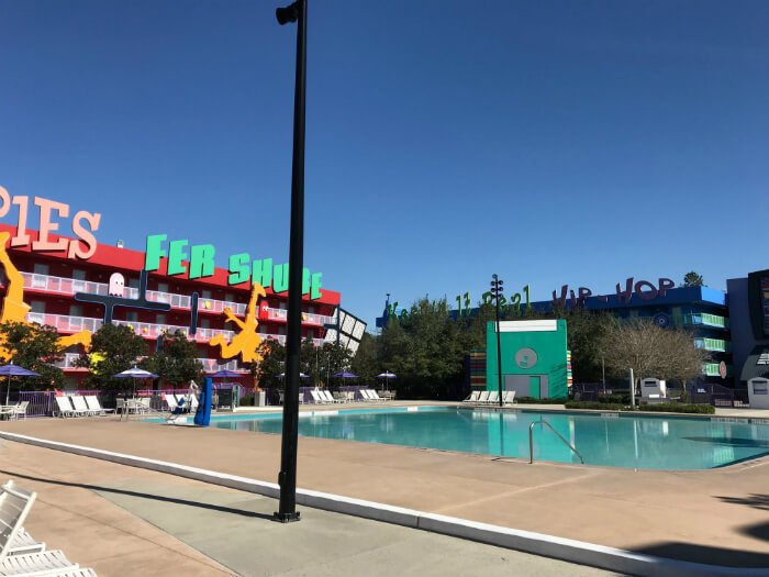 Pop Century may be considered a Disney “value” resort, but it certainly is not lacking in extra fun features that can make your family trip a lot of fun. There are multiple pools: a 1960’s Hippy Dippy Pool with flower-shaped water jets & a children’s pool nearby with a pop-jet water fountain, plus a smaller 1950’s bowling pool & 1990’s computer pool. There’s also fun activities at the Hippy Dippy pool, like Movie Under The Stars, pool parties, trivia, games, etc. There’s also an arcade right off the lobby, Fast Forward Arcade, and a jogging trail & playground.