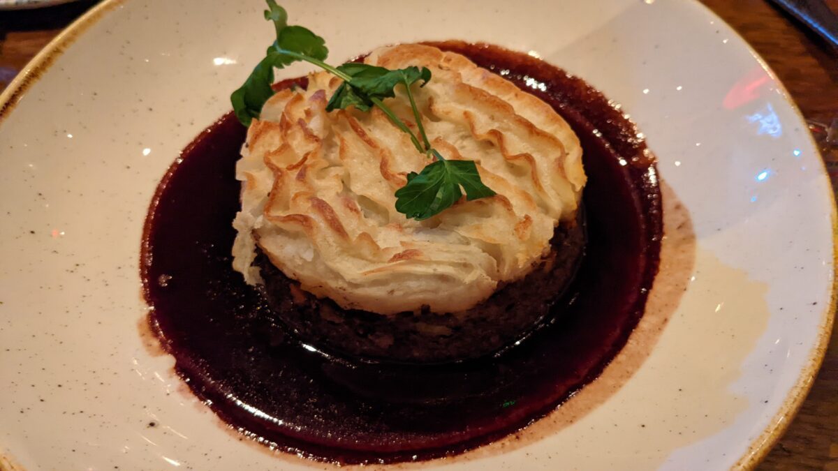 One menu item we really liked was Shepherd’s To Die For Pie. It consists of braised and pulled beef and lamb along with root vegetables in a rich red wine jus and Irish peat