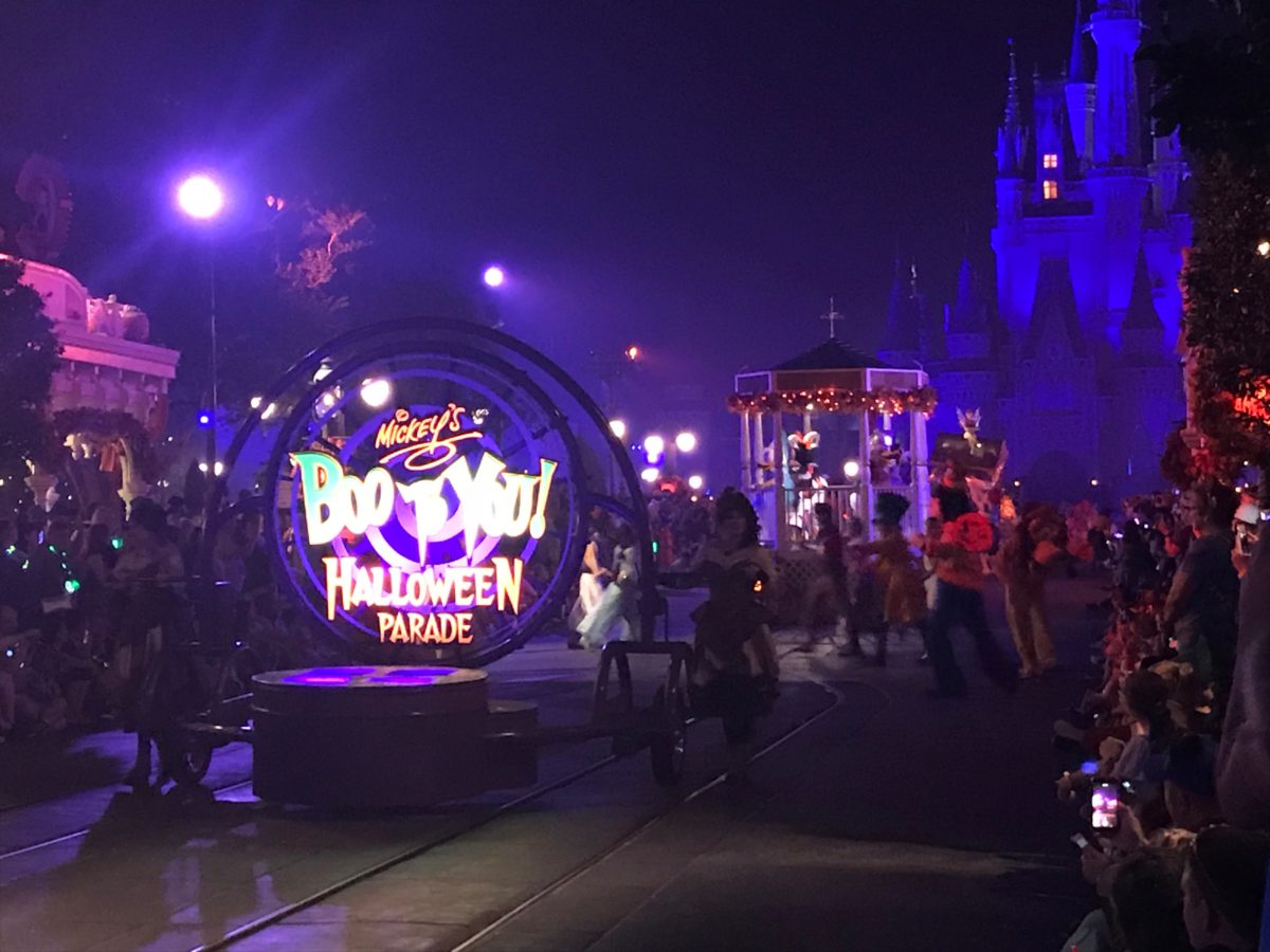The Boo-To-You parade begins in Frontierland and ends up down Main Street. There is something truly magical about viewing the parade on Main Street with Cinderella Castle in the background. However, be advised that this prime viewing location usually has people sitting and staking out their spot well over an hour in advance.
