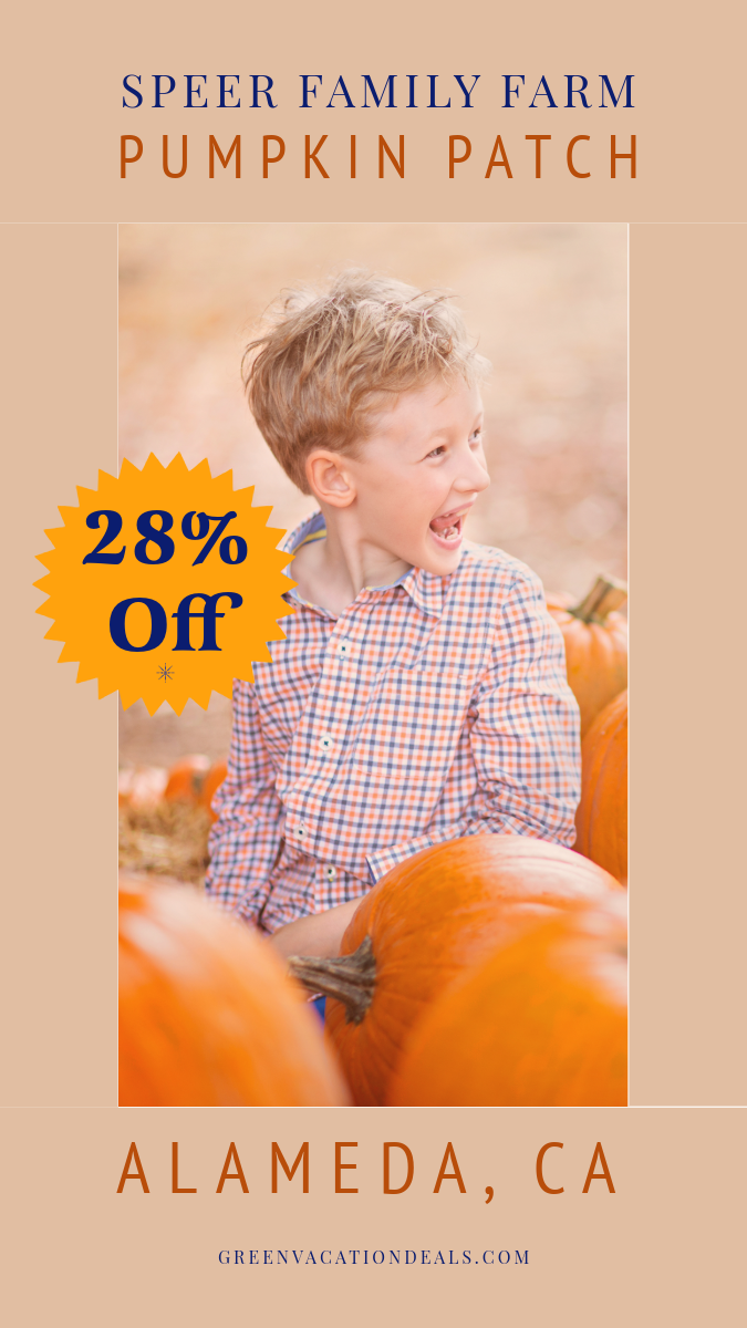 Enjoy family-friendly fall fun at Speer Family Farm Pumpkin Patch in Alameda, California. It features autumn activities, outdoor fun, and great photo opportunities. It is a wonderful annual opportunity for families to enjoy fall fun in the East Bay region of the San Francisco Bay. And you can save money on a visit there.